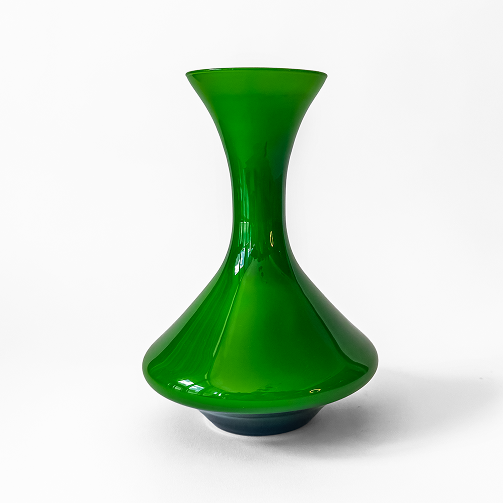 Blown glass piece with a flared body, slender neck, and gently open mouth. Crafted in vibrant green glass pigmented in mass, it features a glossy, even finish with subtle tonal variations that add depth to the surface. The wide base and seamless transition into the neck reflect refined workmanship.
