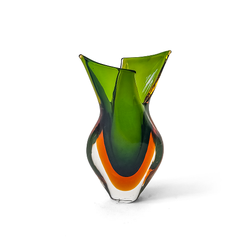 The Murano pieces, made using the sommerso technique, display an intense gradation of greens and ambers encapsulated in transparent crystal. Their organic and fluid forms, with superimposed layers of color, reveal the technical mastery of Venetian workshops and the experimental aesthetic of Italian glassmaking in the 1970s. While unsigned, they are attributed to the renowned designer Flavio Poli, a key figure in the evolution of artistic glass in Murano during the 20th century.