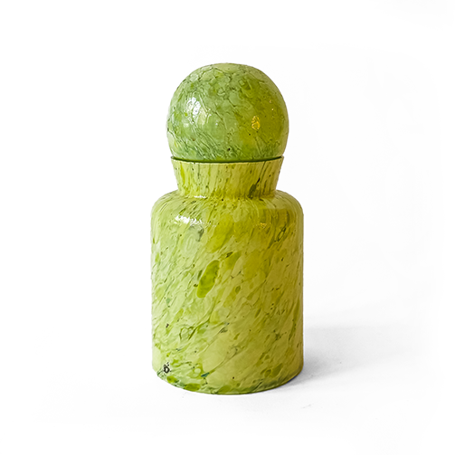 The formal language is cohesive • cylindrical or geometric bodies with clean lines, glossy finishes, and a vibrant mineral-toned palette in green, turquoise, and purple that plays with transparency and material density. The composition functions as a curated ensemble, where each piece enhances the presence of the others.