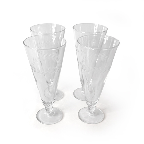 Set of four tall pressed and etched glass goblets, of American origin, produced in the mid-20th century. The design features a vegetal motif in relief that runs through the body of each glass, integrated into the mold as part of the decorative language typical of industrial glassware of the period. The slender silhouette, with a short stem and circular base, balances elegance and functionality.